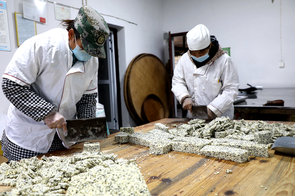 2月4日,岳西县店前镇一家食品作坊里,工人们正在制作米糖。
