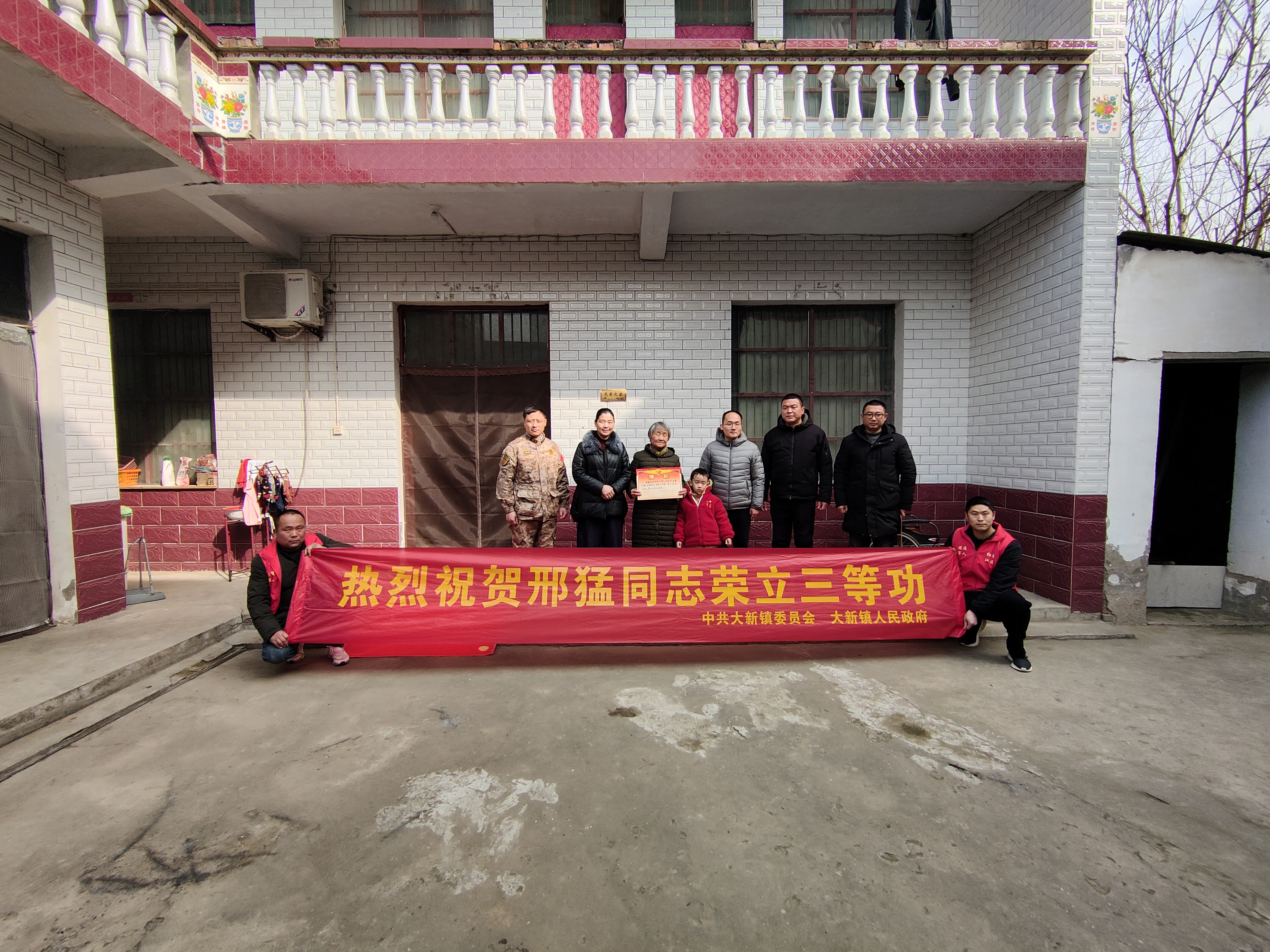 2月9日,太和县大新镇党委书记李艳、镇武装部部长胡标、镇退役军人服务站站长张帅军一行组成慰问组,专程走访慰问荣立三等功的现役军人朱凯杰、邢猛家庭,为军属送上立功喜报、慰问金及诚挚祝福,将组织的关怀与家乡的荣光送至军人家中,以实际行动弘扬拥军优属优良传统。