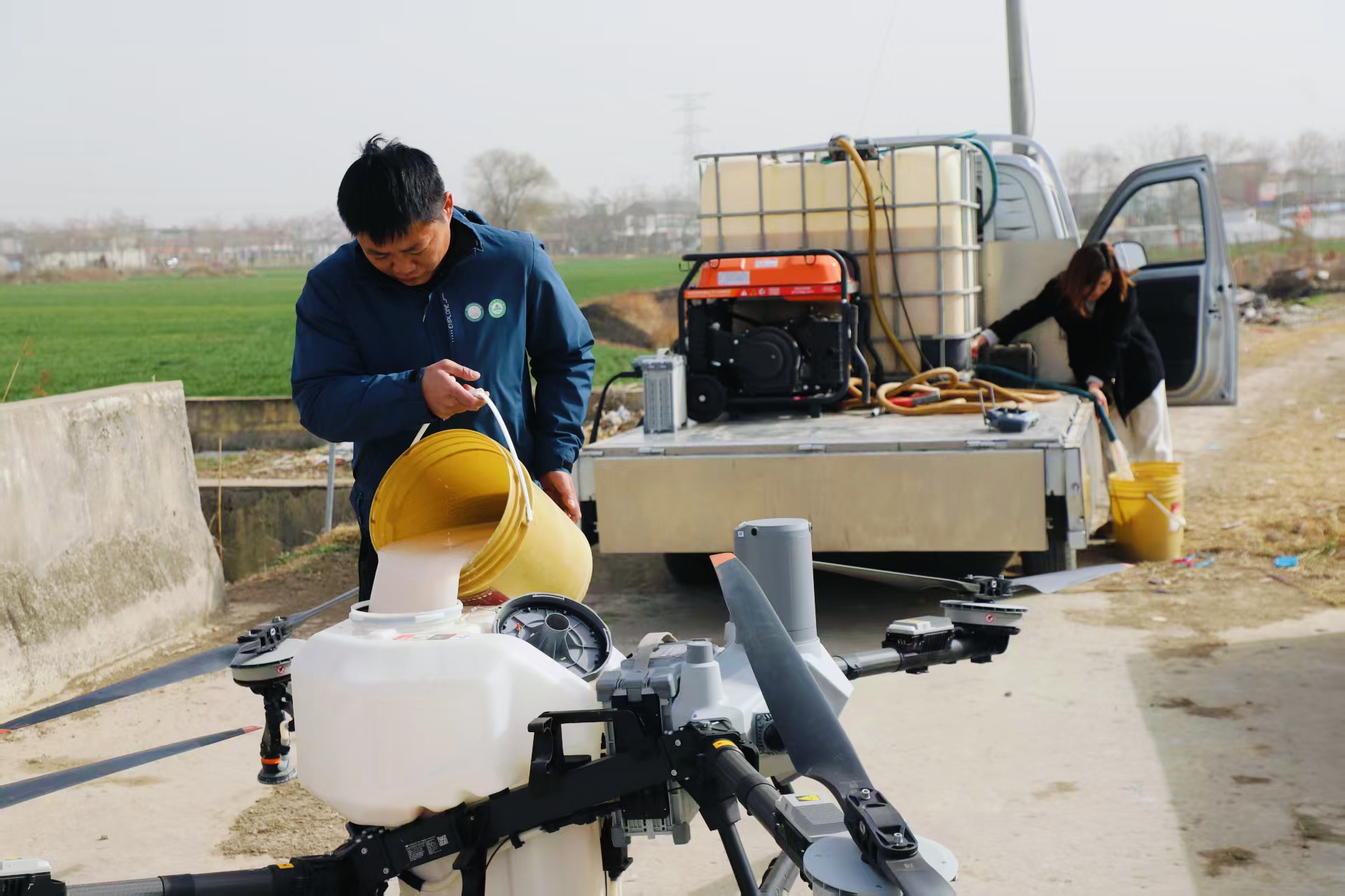 2月22日,宿州市埇桥区西二铺镇葛林村种粮大户雷霆正在使用无人植保机在麦田打药,防治病虫草害的发生。他家今年种植1000多亩优质小麦,计划两天打完一遍。