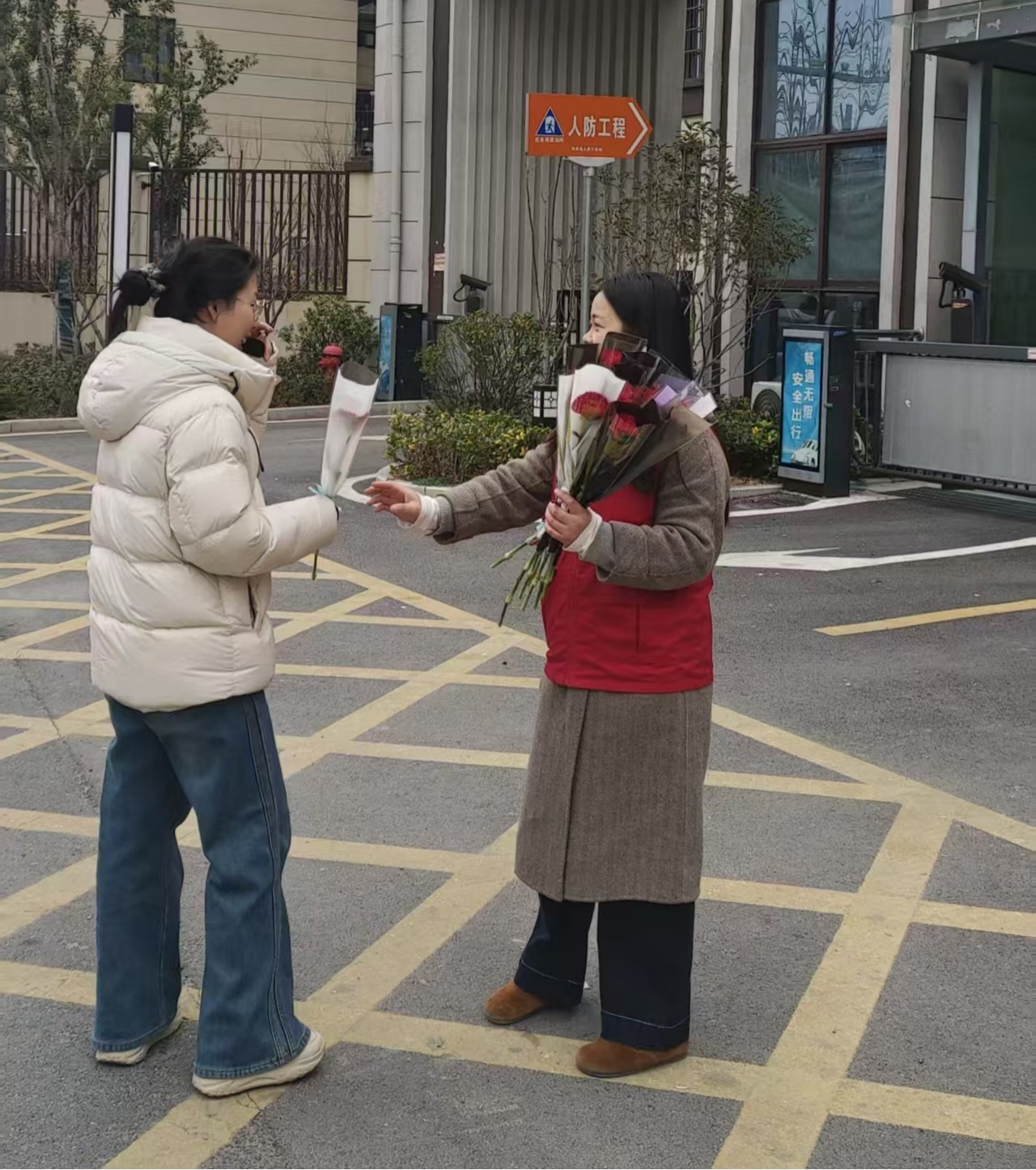 在小区门口、街道旁,社区工作人员和志愿者们身着红色马甲,手持精心准备的鲜花花束,微笑着向过往女性送上节日问候。收到鲜花的环卫工人王大姐笑着说:“每天打扫街道虽然辛苦,但收到鲜花特别开心,感觉自己的付出被大家记挂着!”一位正在接送孩子的年轻妈妈接过鲜花时惊喜地说:“没想到社区会准备这样的惊喜,这朵花让我感受到了被尊重和关爱。”