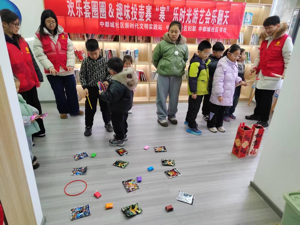趣玩传统,游艺会里觅年味。为丰富儿童寒假生活并传承优秀传统文化,2月6日上午社区书屋举办的“寒乐时光”传统文化游艺会将“欢乐套圈”与“趣味投壶”两项经典游戏相结合,吸引了众多社区儿童积极参与。现场欢声笑语不断,孩子们在游戏中感受传统游艺的魅力,营造出欢乐祥和的社区氛围。