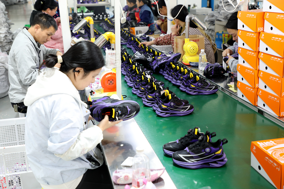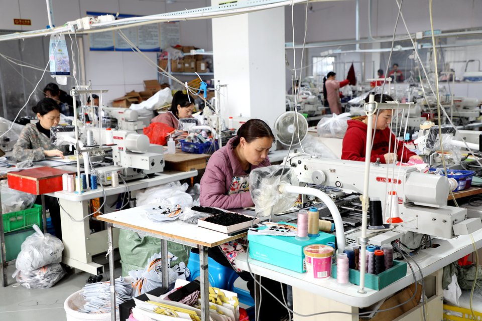 3月25日,岳西县店前产业园内,一家鞋业公司的工人正在赶制童鞋。