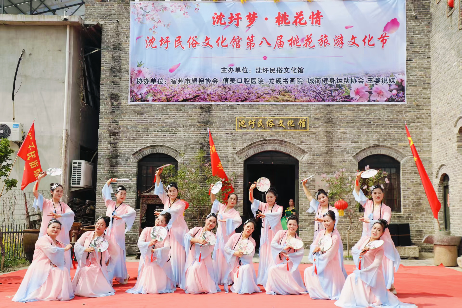 本届活动由沈圩民俗文化馆承办,宿州市旗袍协会、埇桥区龙砚书画院、宿州市城南健身运动协会、王婆说媒、宿州市信美口腔医院等爱心企业协助举办,20多个群众文化艺术团队轮番上阵前来助演,共同庆祝沈圩村第八届“桃花节”开幕。