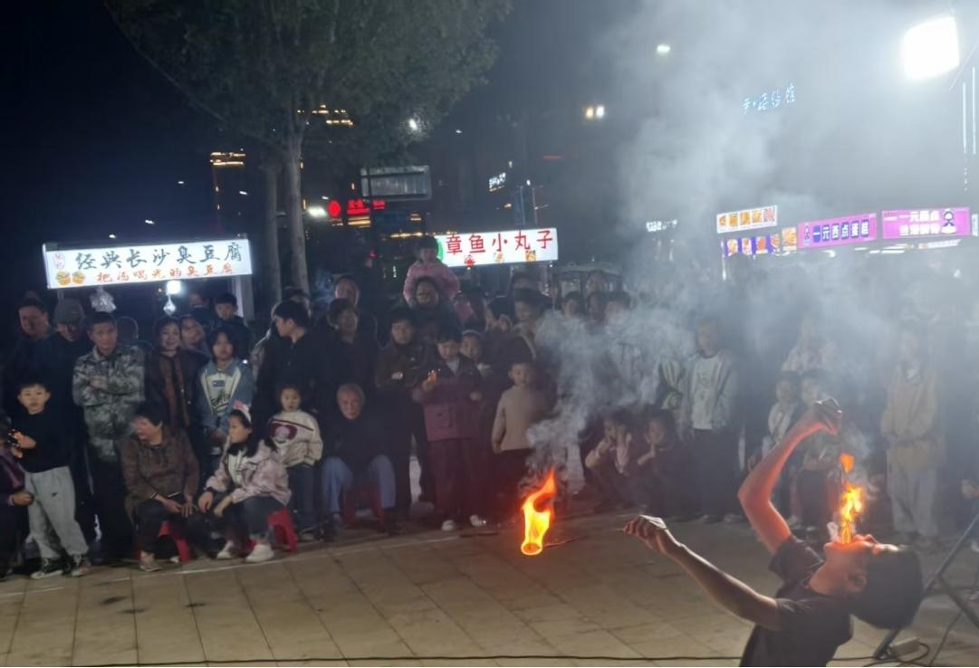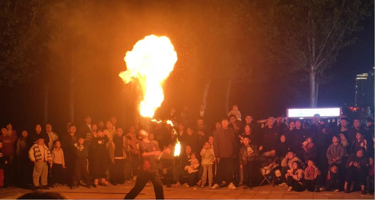 夜幕降临,华灯初上,社区新时代文明实践广场早已人头攒动、热闹非凡。演出正式拉开帷幕,喷火等经典杂技节目轮番登场。表演艺人技艺精湛,随着熊熊火焰在夜色中绽放,一次次将现场气氛推向高潮,惊险又震撼的表演让现场观众目不转睛。艺人沉稳娴熟的动作、高难度的技艺展示,引得台下掌声、欢呼声此起彼伏。