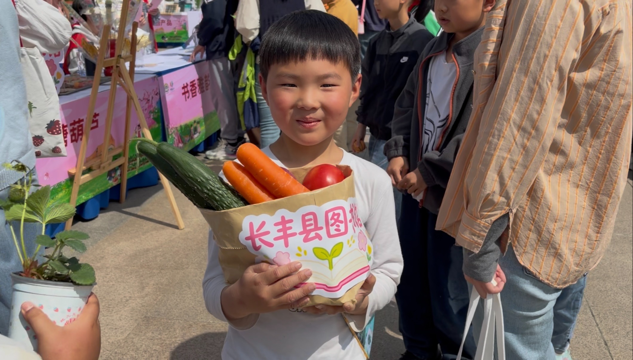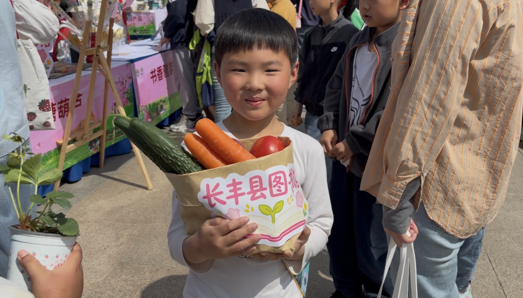 在一旁的“换书交友、墨香流转”图书共享交换区,不少读者拿着自家闲置的书籍前来置换新鲜蔬菜,闲置书籍在流转中获得新生。而“诗韵长丰、闯关挑战”区同样人气十足。大家随机抽取写有诗词的草莓便签,现场速记,闯关成功即可领取文具礼品,丁子杨小朋友举着糖葫芦和绿书签,向记者展示他的“战利品”:“特别开心,收获很多!”